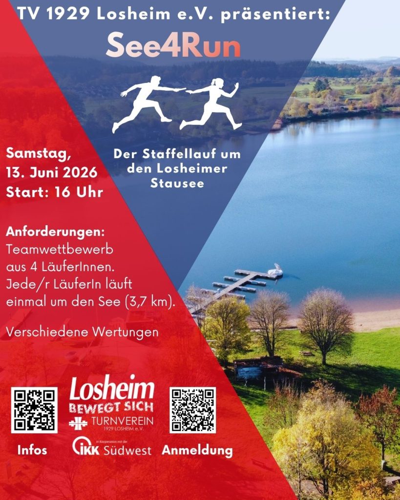 Somit starten alle Staffeln zusammen um 16.00 Uhr. Aber keine Sorge, bei der Prämierung bleibt alles unverändert. Meldet eure Staffel noch bis zum 6.6.2024 an und seid dabei! Genießt mit uns einen sonnigen Tag in der wunderschönen Atmosphäre am Losheimer Stausee. Wir freuen uns darauf, euch beim Staffellauf begrüßen zu können.